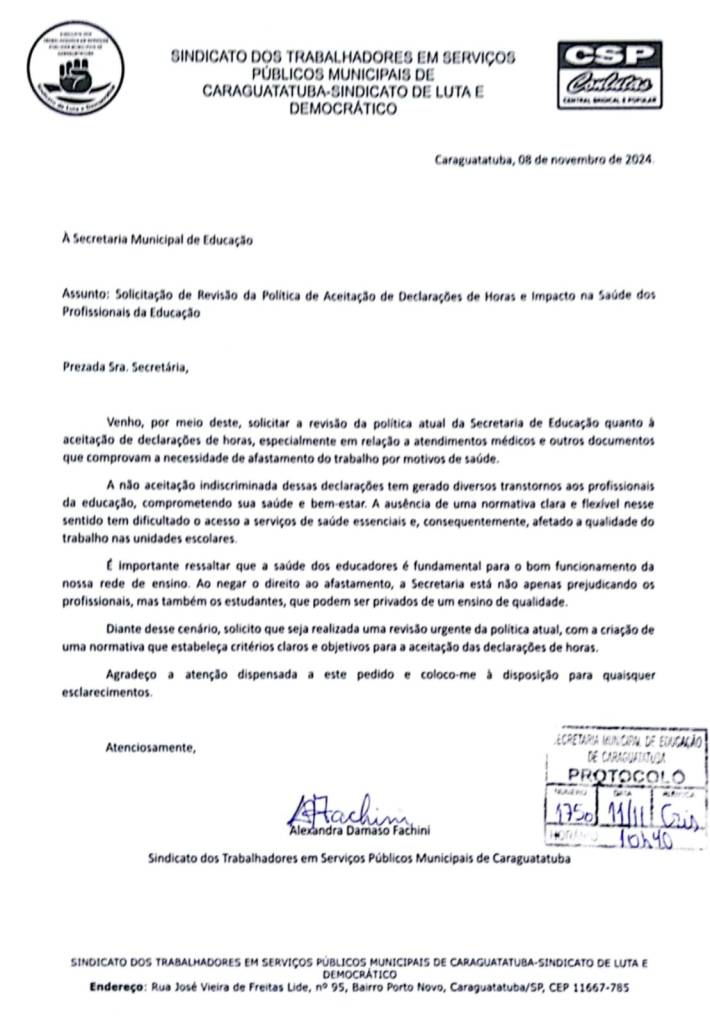 O SindCaraguatatuba segue atuando na defesa dos servidores. Ontem, dia 11/11, foi protocolado junto à Secretaria Municipal de Educação um requerimento para que reconsiderem a forma como é tratada o recebimento das declarações de horas nos casos de consultas, exames ou tratamentos de saúde. Os trabalhadores e trabalhadoras da Educação, que já possuem rotinas de trabalho desgastantes, ficam devendo essas horas quando precisam se ausentar. Não é justo!