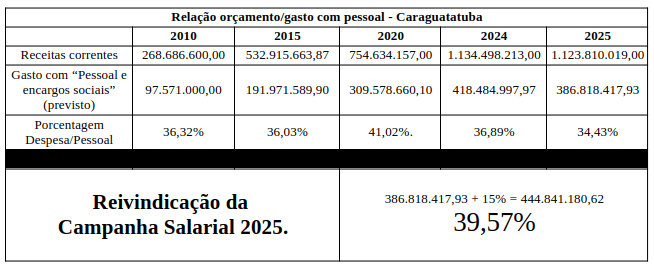- 15% de aumento salarial para compensar os mais de 40% de perdas acumulados nas últimas décadas. E ainda gastaremos bem menos do que a média dos outros municípios e estaremos bem longe do limite estabelecido pela Lei de Responsabilidade Fiscal.
